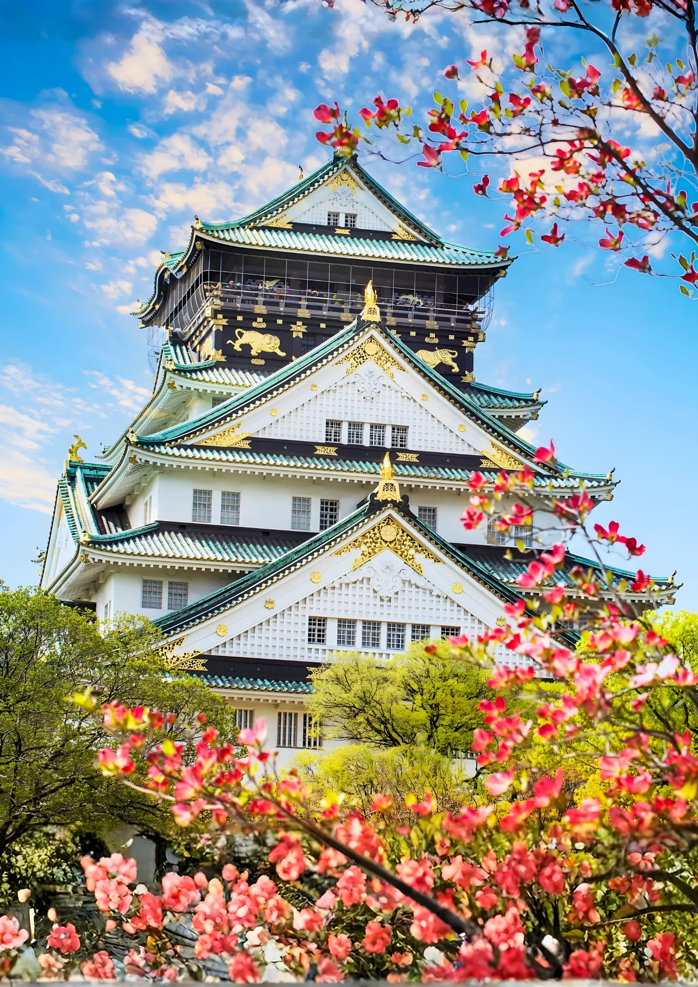 Lâu đài Osaka là một trong những biểu tượng lịch sử nổi tiếng của Nhật Bản, nổi bật với kiến trúc uy nghi, mái ngói xanh và chi tiết mạ vàng, bao quanh bởi hào nước và công viên rộng. Chỉ cần chụp bên ngoài cũng cảm nhận được vẻ hoành tráng, đặc biệt đẹp vào mùa hoa anh đào hoặc lá đỏ. (tham quan bên ngoài)