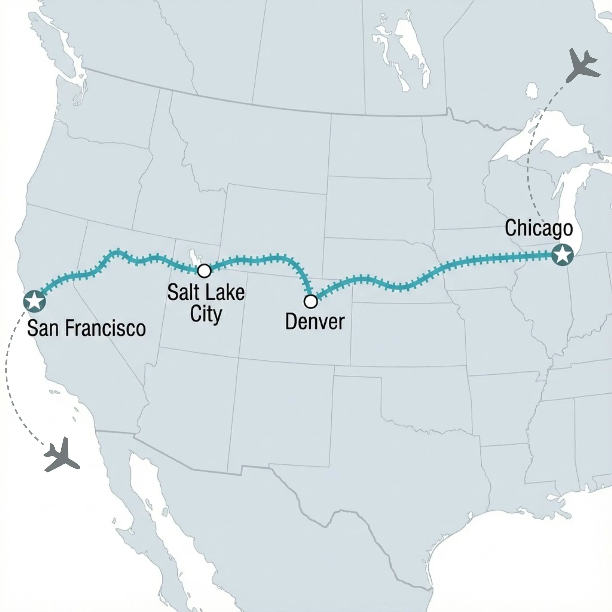 Hành trình landtour cao cấp đưa du khách trải nghiệm những cung đường sắt đẹp nhất nước Mỹ, băng qua Chicago, Denver, Salt Lake City đến San Francisco trên chuyến tàu California Zephyr huyền thoại. Tour nổi bật với cảnh quan thiên nhiên ngoạn mục của dãy Rocky Mountains, hẻm núi Glenwood và dòng sông Colorado, kết hợp nhịp sống đô thị đặc trưng, mang đến trải nghiệm du lịch chậm, sâu và đầy cảm xúc.