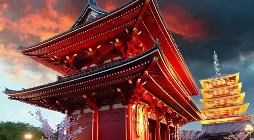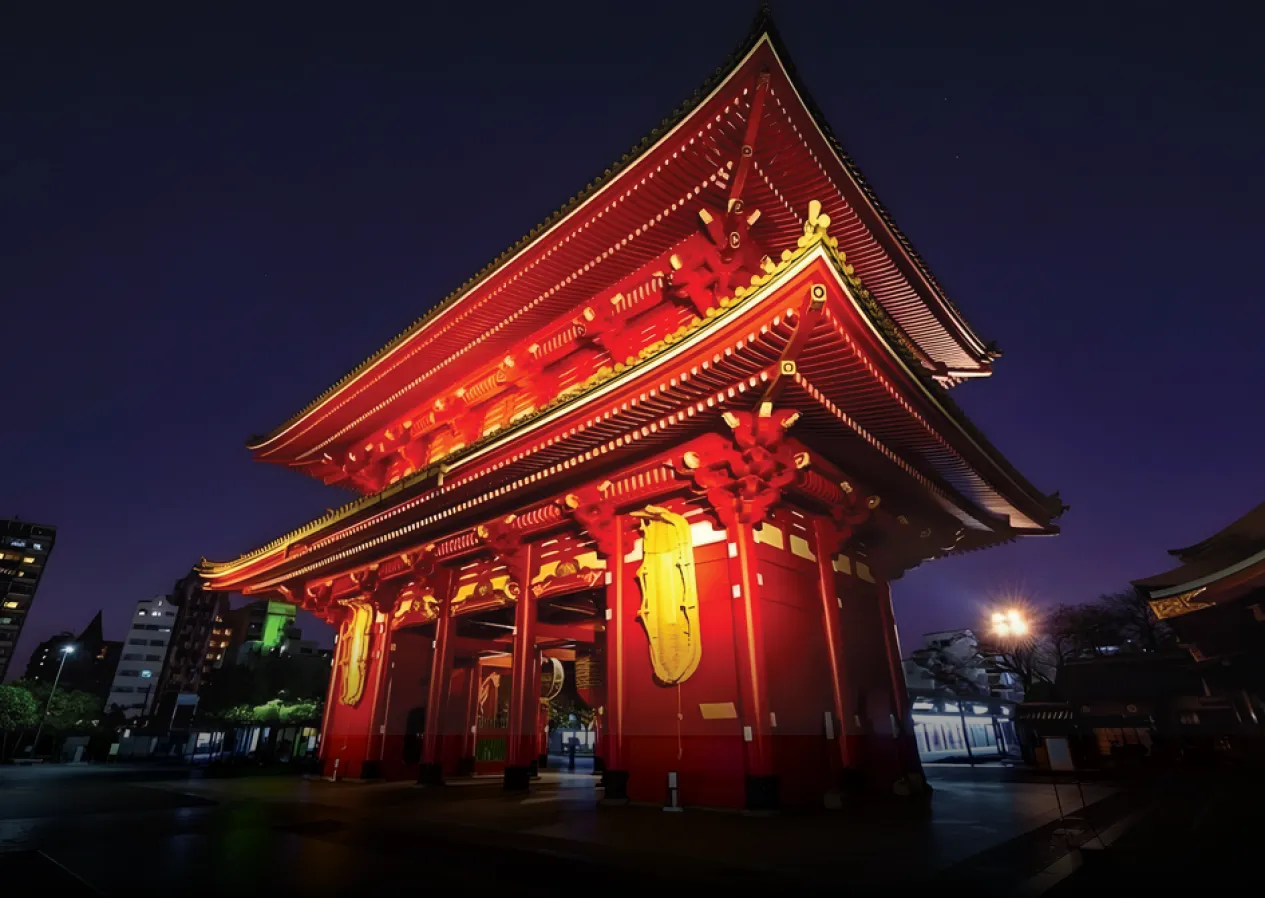 Ngôi đền cổ nhất và linh thiêng bậc nhất Tokyo, nổi tiếng với cổng đèn lồng đỏ Kaminarimon và phố mua sắm Nakamise truyền thống. Đây là nơi du khách cảm nhận rõ nét văn hóa Nhật Bản thời Edo.
