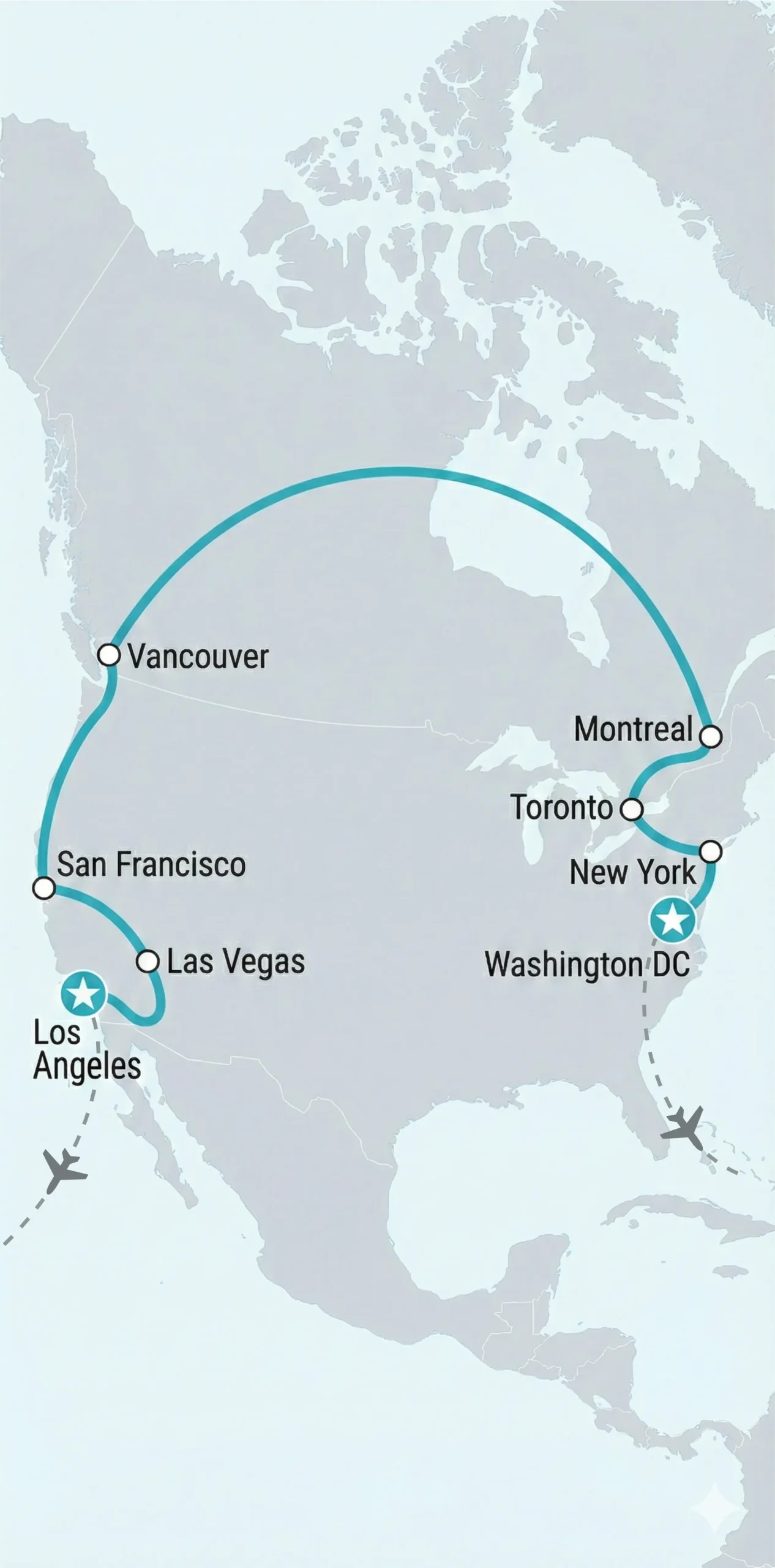LOS ANGLES - SAN DIEGO - LAS VEGAS - SAN FRANCISCO - VANCOUVER - MONTREAL - OTTAWA - QUEBEC - TORONTO - NIAGARA - BOSTON - NEW YORK - PHILADEPHIA - WASHINGTON D.C.